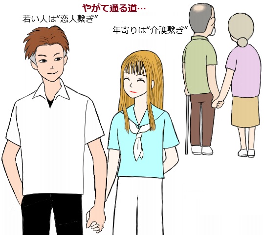 夫婦で散歩中、私たちの前を若いカップルが手を繋いで歩いていた。 妻 「前の二人、若いネ」 私 「俺らの10年前みたいやなア」 妻 「なんでやねん!どうみてもあの子らは20代やで」 私 「そうか、俺らの孫やなあ」 妻 「そうやで。トンチンカンな事を言われるとマゴつくわ」 私 「お、ダジャレか。あの子らエエ服を着てるなあ。マゴにも衣裳やなあ」 妻 「返すか。でもその馬子は馬の世話をする様な下働きの人。あの子らには関係ないわ」 私 「そうか。それにしても仲がエエな。あの二人の手は恋人繋ぎて言うんやろ」 妻 「お互いの愛情を確かめ合いたい、強い絆で結ばれたい時に繋ぐ手やね」 私 「あの二人は出来てるで」 妻 「若いカップルやねんから、出来ててもエエやん」 私 「もう、何回ぐらいやってるんやろな」 妻 「ゲスな勘繰りはやめて!程度の低い人間になるで」 私 「・・・・・」 妻 「ほら、図星つかれて黙ったな」 私 「いやいや、違うで。何回やってるかって、デートの回数の話や」 妻 「そうかいな?アンタの言い方に品が無いから勘違いするねん」 私 「それはそうと、俺らもまだ手ぐらい繋いでもエエやろ?」 妻 「はいはい。こっちは恋人繋ぎやなくて“介護繋ぎ”やけどな」 私 「そうやな。手を放したらコケるから、俺らは強い絆で結ばれてますわ」 妻 「強い絆ではなく、くされ縁や」 私 「まあ、これからもよろしく」 ※謎かけ:恋人繋ぎとかけて、手厚い情けに感謝すると解く。どちらも(好意・厚意)があります #謎かけ #おじんギャグ #恋人繋ぎ #ダジャレ爆発 #ひとコマ漫画 #チャレン爺有 #スナックタイガース #堺でおもしろい店・人 #有村正 |