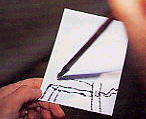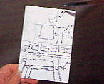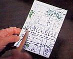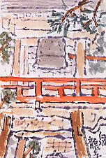 ポイント ポイントを決めて描く ●目に入る風景を全てハガキに収めようとせ ず、いちばん描きたいポイントを決め、それを 中心に構図を決める。 ●ハガキの下から、あるいは上から、順番に 描いていく。あっちを描いたりこっちを描いたり すると、バランスが崩れてしまう。 ●彩色は大まかでもいいから、実際に外で風 景を見ながら塗ったほうがよい。 ●一部分だけでも具体的に描写すると現実感 が出る。例えば大きな枝ぶりを描く時には、 特徴的な葉を少し描きこんでから全体的に色 を塗るようにする。 ●ハガキを10枚くらい重ねてもっと、画板がわ りになって、屋外でも描きやすい。 ●たった一言だけでも、文字が入ると画面が 引き締まる。 ●墨で描く時は、あらかじめ磨っておいた青墨 の液を小さな容器に入れて持っていくとよい。