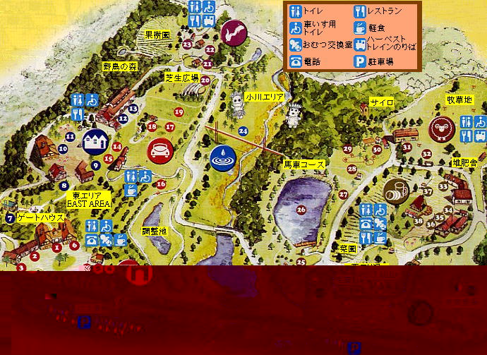 | 24吊り橋 | 25バッテリーカー 26ボート池 27小動物ふれあい広場 28アヒルのレース場 29乗馬コース 30ふれあい広場フードハウス 31シープハウス 32ふれあい広場 (ハーベスト列車停留所) |