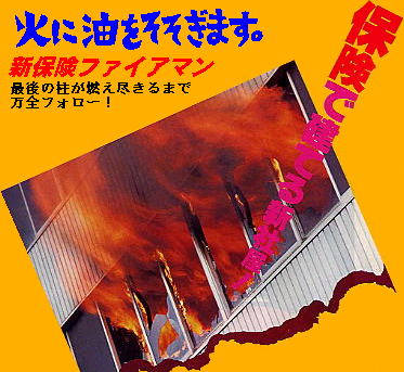 これまでの火災保険に対する不満を徹底的 に分析調査、4代田が自信をもってお送り するのが、火勢お助けサービス付き新保険 「ファイアマン」。もし、突然、万が一、火災が 発生したならば、お電話一本で火勢お助け サービス隊が、現場に急行。消防署員を装 って、しばしも休まず火に油をそそぎます。 もちろん、対象物件が燃え尽きるまで完全 サービス、保険金全額支払いでご期待に お応えします。 |