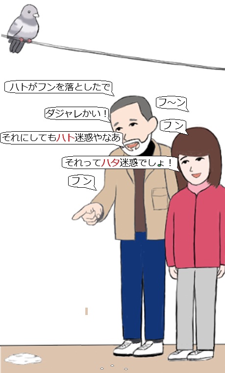 | いつも散歩する遊歩道に時どき鳩のフンが点在している。 妻 「この小さい点みたいのは鳩の子供のんかなあ?」 私 「そうかも知れんなア」 妻 「そう言えば鳩の群れの中に子供は見かけへんネ。いてるんかなあ」 私 「いてるで。イトコ、ハトコ」 妻 「それは親族の話や」 私 「あ、そう言えば小鳩くるみていてたなア」 妻 「そんな大昔の子役、誰も知らんわ」 私 「俺と同じ年やから73年前にデビューやな」 妻 「私が生まれた年やん」 私 「ああ、そうか。かなり大昔やな」 妻 「あ、あそこに大きなフンがあるわ」 私 「ペンキをこぼしたようなあのフンは、お腹を下したのんと違うか」 妻 「ホンマやね」 私 「普通の鳩はポ・ポ・ポて鳴くけど、あのフンの鳩はピ・ピ・ピーて鳴くのんと違うか」 妻 「長渕剛か!」 私 「ろくなもんじゃねえ」 妻 「アンタのジョークが、ろくなもんじゃねえ、やわ」 ※ハトの子供を見かけない主な理由 成長が早い ハトの親は、オスとメスが協力してひな鳥に必要な栄養を分泌できるため、ひな鳥の成長が非常に速いです。 孵化から巣立ちまでの約1ヶ月の間、ハトの子供はほとんど巣の中で過ごします。巣立ちを迎える頃には、親鳥とほとんど同じくらいの大きさに成長しているため、群れの中にいても区別がつきにくいのです。 ※謎かけ:ハトのフンとかけて、スポークスマンの仕事と解く。どちらも(大便・代弁)です #謎かけ #おじんギャグ #ハトのフン #ダジャレ爆発 #ひとコマ漫画 #チャレン爺有 #スナックタイガース #堺でおもしろい店・人 #有村正 |