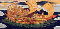 | 湯川宣阿ゆかわせんあ文明15年(1483)没 | 遣明船の図。堺からの対明貿易は 湯川宣阿によって 始められ、約70年 間続いた。 |